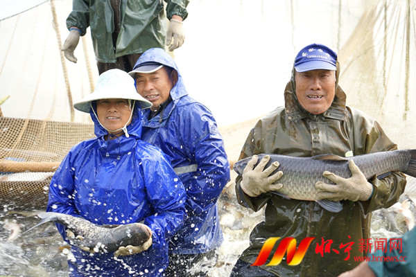 2023年10月13日,洪铺镇新岗村在内洋湖组织开湖捕鱼,翻滚跳跃的鱼儿,和着宽广宏荡的湖面、清澈明亮的湖水,绘就了一幅水清鱼欢的生态丰收画卷,大家脸上都洋溢起了丰收的喜悦。洪铺镇有“水乡”之称,境内河湖塘一万余亩,该镇大力发展绿色生态养殖,年产值达4 000余万元,有力带动了村级集体和村民入股、就业增收。洪铺镇还积极探索湖水养鱼观光农业新模式,通过产业融合、农旅发展、农事体验等方式,打造田园综合体项目,大力发展乡村旅游,推动一三产业深度融合,助力乡村振兴。檀志扬 赵林玉 摄