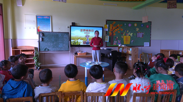 当天,在黄龙镇中心幼儿园,老师正通过ppt图文方式向幼儿们讲解世界粮食日的由来,传播爱粮节粮知识,让孩子们学会科学食粮、安全储粮、食品安全等内容。