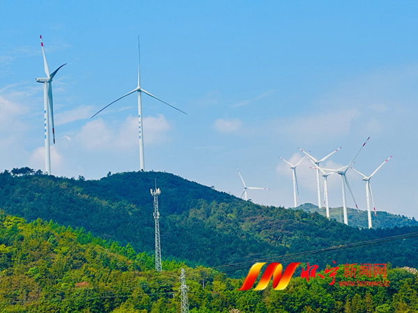 11月13日,月山镇风电场,白色的风机矗立高山之巅,与蓝天白云同框,蔚为壮观。近年来,我县利用高山风力资源丰富的优势,积极发展风力发电项目,助力绿色低碳发展。檀志扬 洪胜武 摄