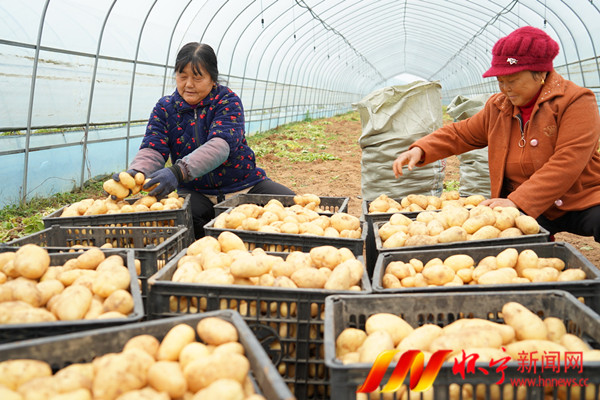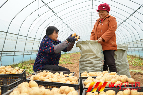 12月12日,腊树镇芝岭村大棚土豆喜获丰收,村民按照线上线下订单装袋等待发货。芝岭村发展大棚土豆种植30余亩,年产量达15万公斤,年实现村级集体经济增收30余万元,同时带动周边上百名村民在家门口就业。檀志扬 程海珠 摄