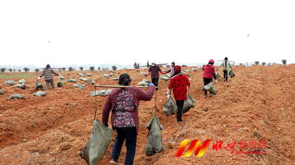 本网讯 聆听贺词,凝聚力量。1月2日是元旦假期后第一天上班,在公岭镇三铺村吴老村民组,几十名群众正在刚平整好的蓝莓种植基地里垫衬底肥,大家肩挑手提,忙的不亦乐乎。据了解,根据村里规划,今年公岭镇三铺村投资200多万元,打算利用“村集体+公司+农户”模式,新增蓝莓规模化种植近200亩,年产值可达400万元。
