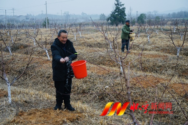 3月7日,腊树镇风雅黄桃种植专业合作社村民为黄桃林施肥。腊树镇种植黄桃1000余亩,年产黄桃约110万斤,产值达800万元,带动80余户农户就近务工,人均增收1.8万元。檀志扬 江文瀚 摄