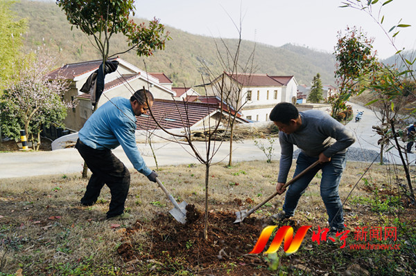 3月24日,江镇镇新合村村民在自家房前屋后栽种树苗。江镇镇坚持一村一品、整村推进,做到见缝插绿、应绿尽绿,动员广大村民在农村“四旁”(即宅旁、村旁、路旁、水旁)种植薄壳山核桃、香榧等经济林苗木,让群众既获得较高的经济效益,又美化了生活环境。檀志扬 刘庆生 摄