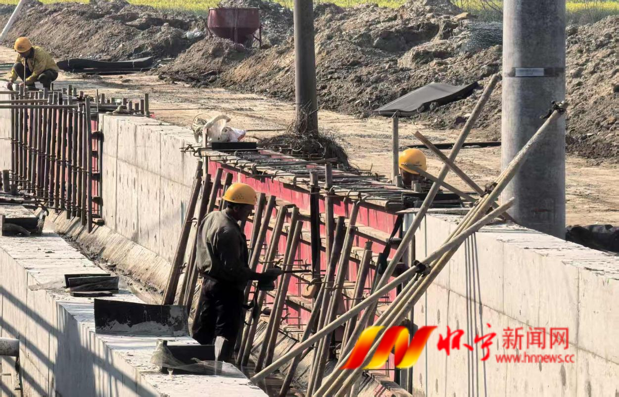 在施工现场,工人们头戴安全帽,紧张有序地进行模板搭建、钢筋绑扎与混凝土浇筑作业。红色模板与灰色混凝土衬砌交错,脚手架与支撑杆件林立,远处的土坡与金黄的油菜花田相映成景,勾勒出一幅生动的春日水利建设画卷。“这段时间天气好,我们加班加点赶进度,争取按时完成主体工程,不耽误老百姓的日常生产生活。”现场工人一边拧紧螺栓,一边说道。